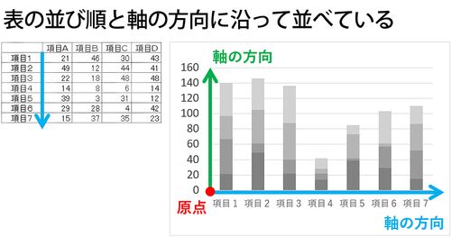 Excelでグラフを作成するには事前に表を入力する必要がありますが、それは、グラフを描画するときに軸の方向に沿って項目と数量を並べるからです。表の項目の並び順に従ってグラフが作られます。 そして、項目とデータは1対1に対応している表でなければな…